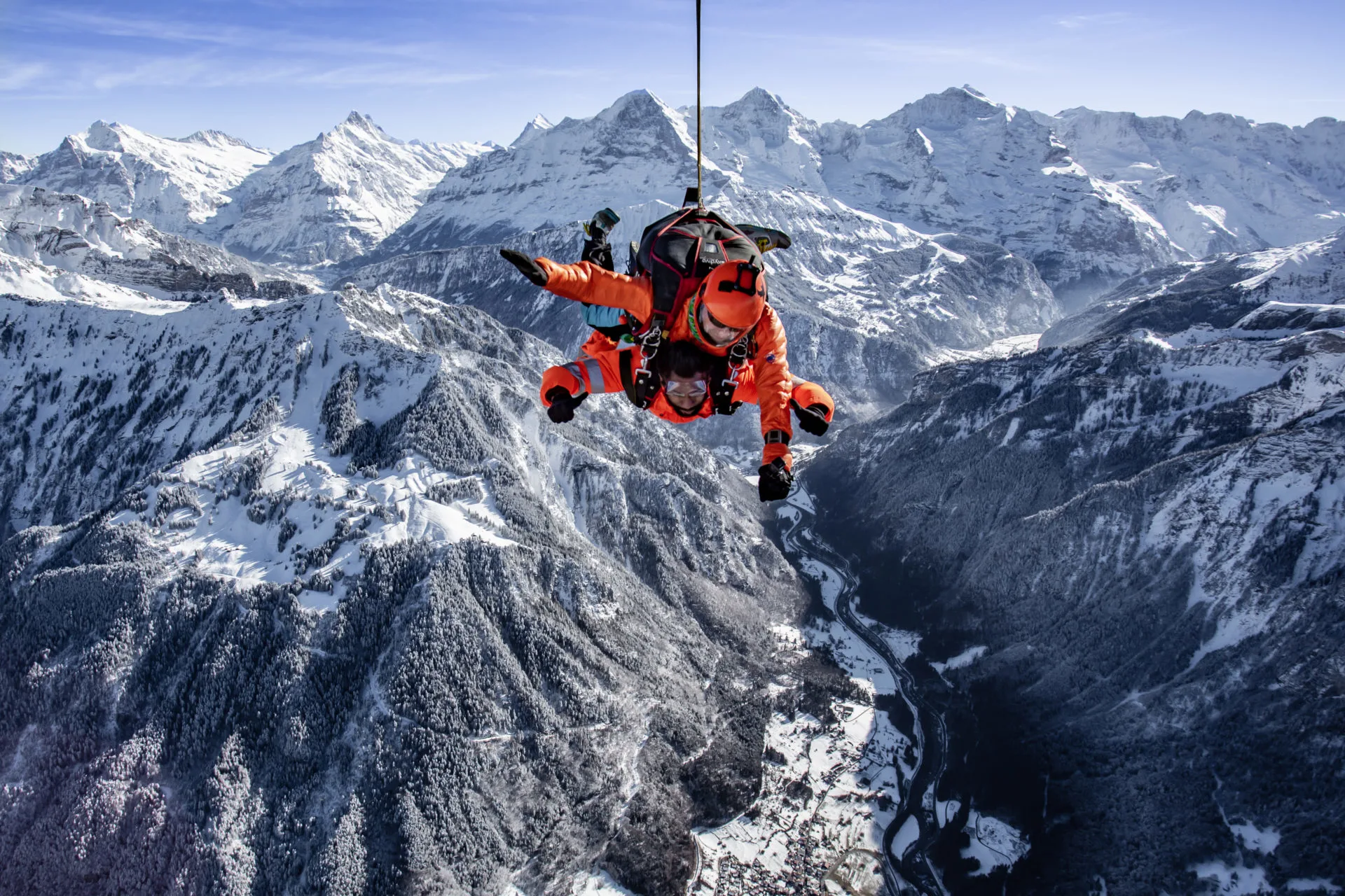 Your winter activity begins with a 15-minute scenic flight to the jump height. Enjoy the view over Interlaken, the two lakes and the breathtaking Alps, including the famous trio of the Eiger, Mönch and Jungfrau. The flight is followed by a 45-second, adrenaline-filled freefall from a height of 4000m. As soon as the parachute has opened, you can take a deep breath and enjoy the 5-7 minute canopy flight before landing gently on the ground again.