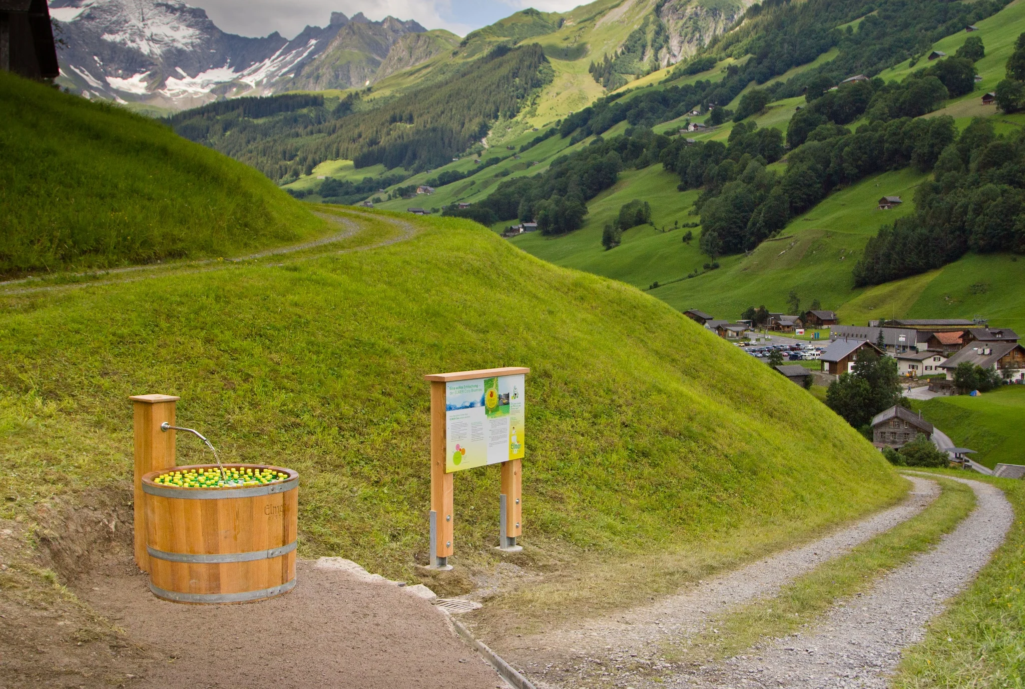 Embark on the ELMER Citro Spring Trail and immerse yourself in the fascinating world of mineral water. This themed trail takes you through the picturesque Sernftal valley and the opportunity to discover the history of ELMER Citro. Refresh yourself with a cool ELMER Citro at the fountain.